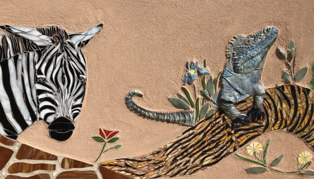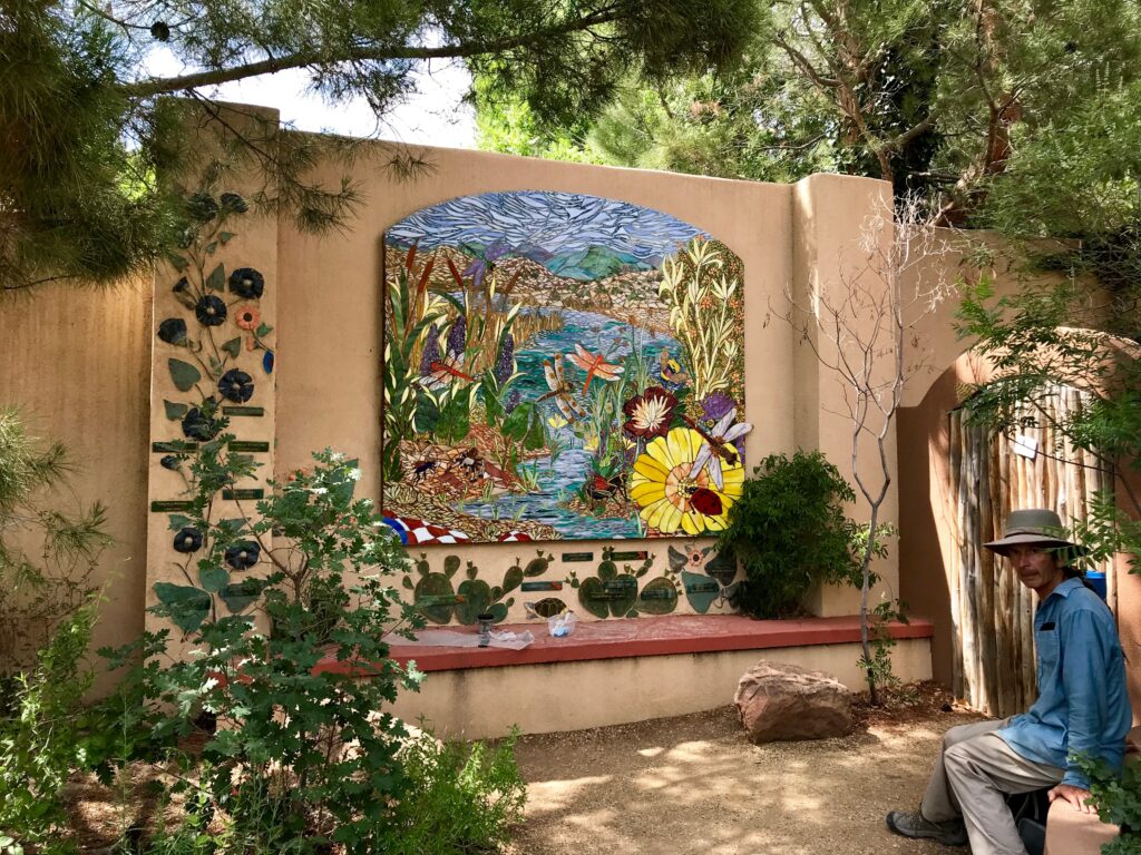 Cirrelda Snider Bryan and Laura Robbins wrote and compiled the publication with layout by Mary Lambert. A Self-Guided Tour is available in both digital and paper form. With forty full-color pages, it celebrates 65 sites that are accessible to the public, located in Albuquerque, Rio Rancho, Tijeras, Mountainair, Edgewood, Placitas, and Bernalillo. The digital guidebooks are available through this site and MosaicNewMexico.org. While they last, hard copies are available at Wild Hearts Gallery in Placitas, NM. The goal of the guide is to bring attention to the wide array of creative public mosaics in our community, including individual and group endeavors funded by private businesses, churches, various organizations, volunteers, and government agencies.