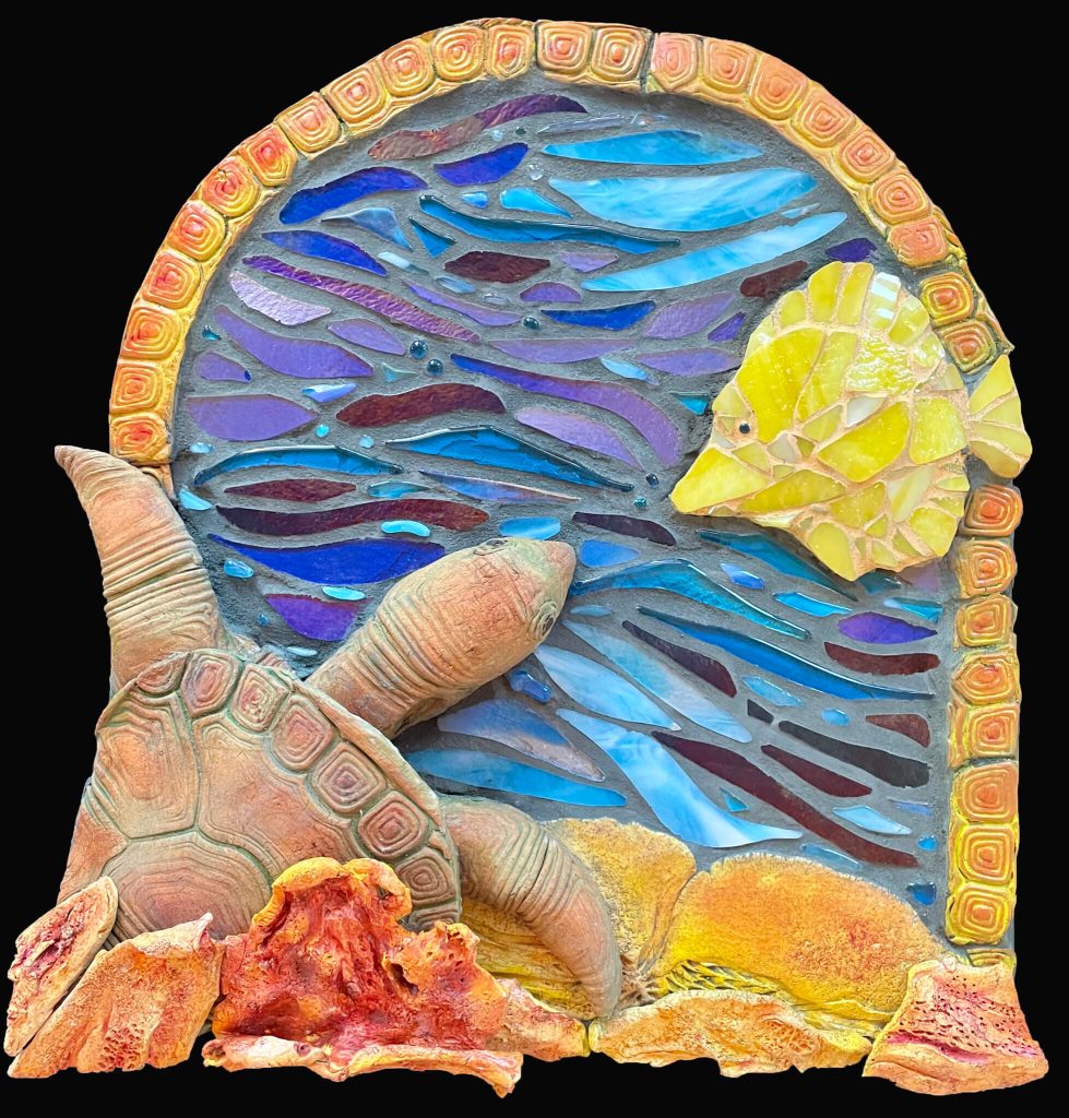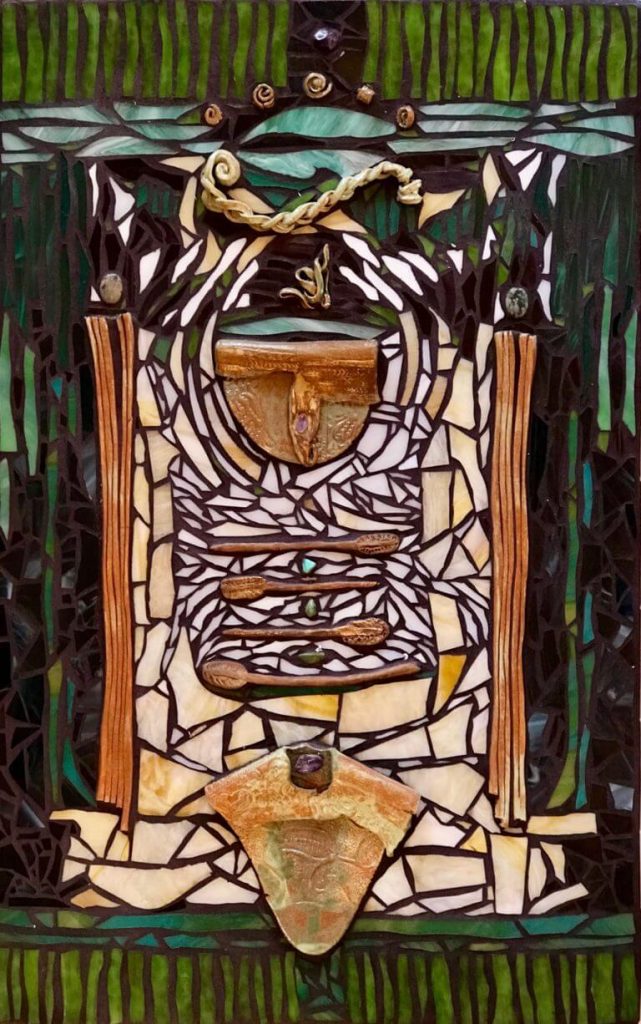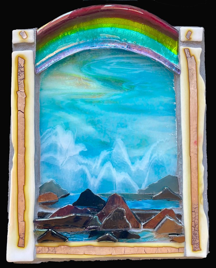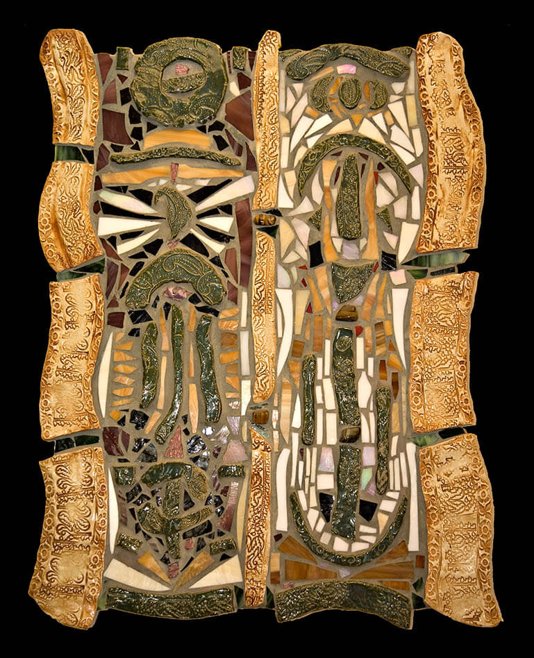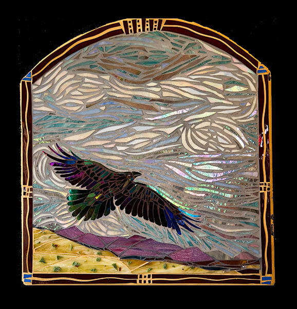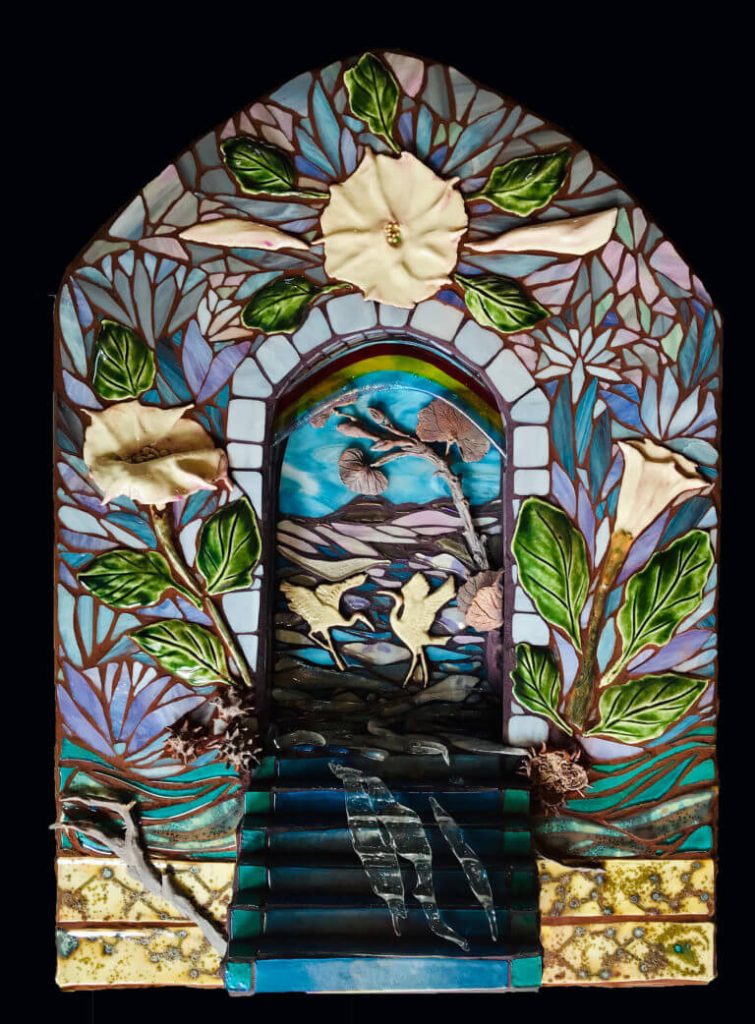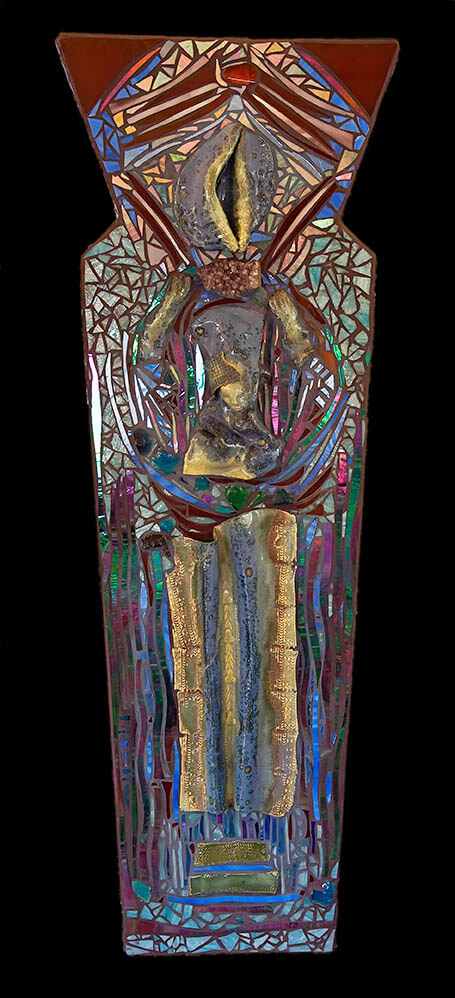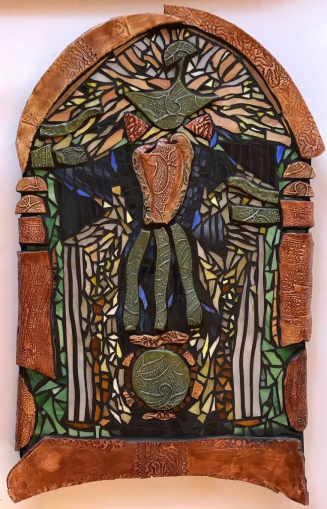 Using a mosaic as an illustration, Laura retells and reimagines her childhood stories through a lens of personal wisdom. Dreams, insights, and teachings take on a storybook form, honoring mystery, the unknown cosmos, nature, and heart. Pieces of uniquely formed clay join with cut, fused, and slumped glass to create the mosaic images. The series was displayed at Wild Hearts Gallery, Placitas, NM, during the month of October 2025.
