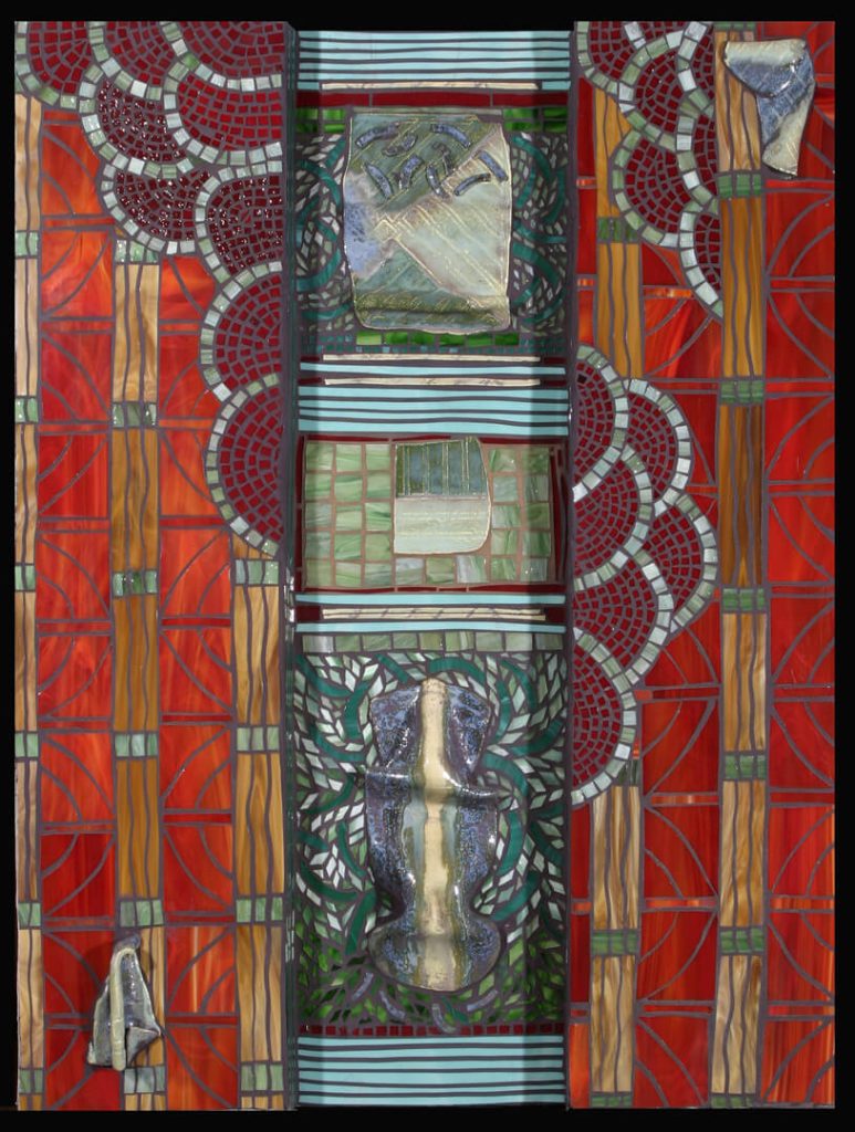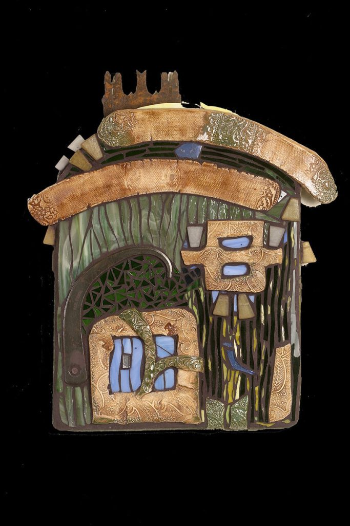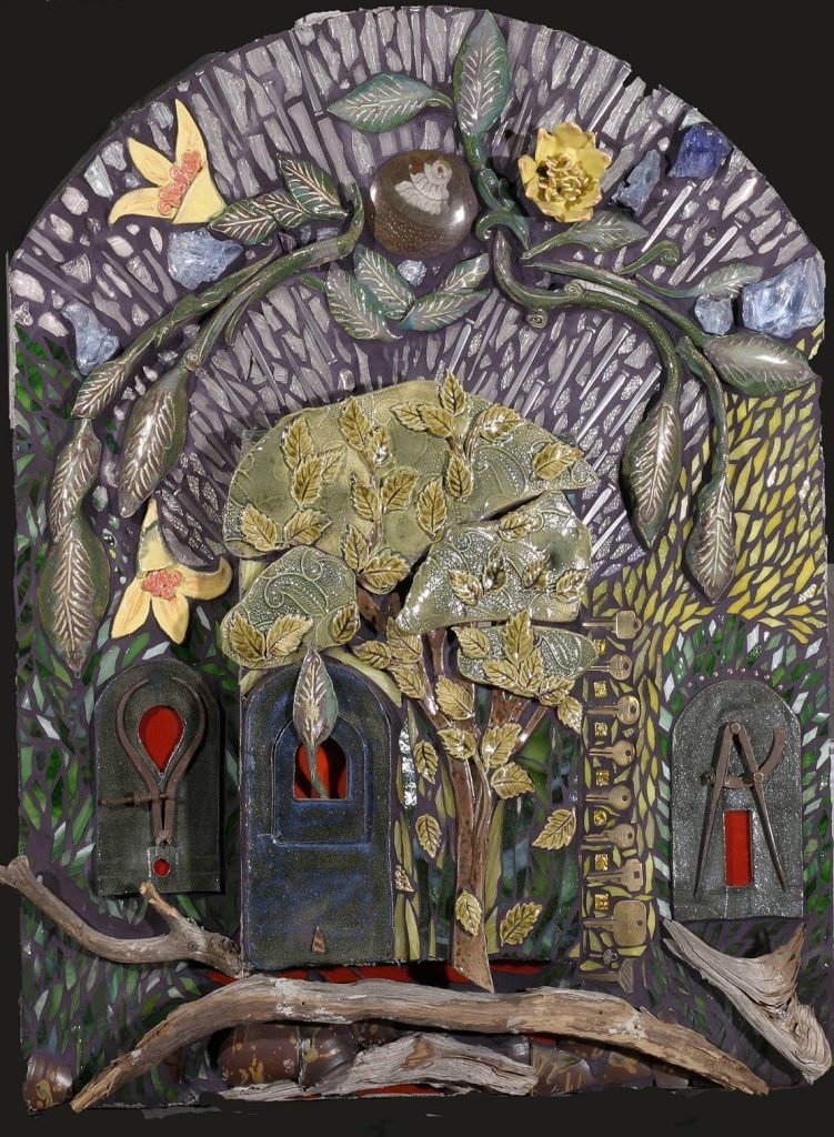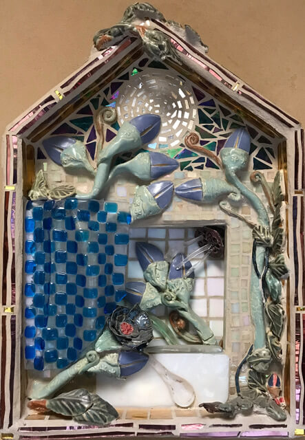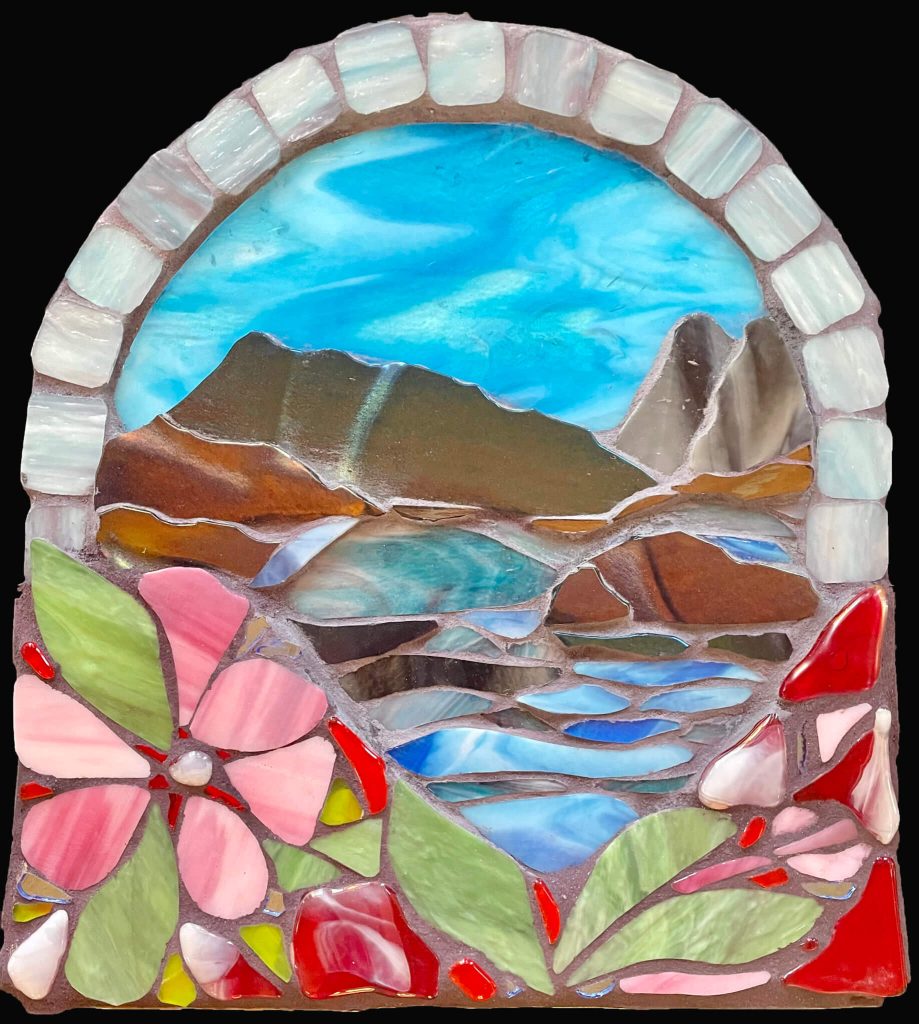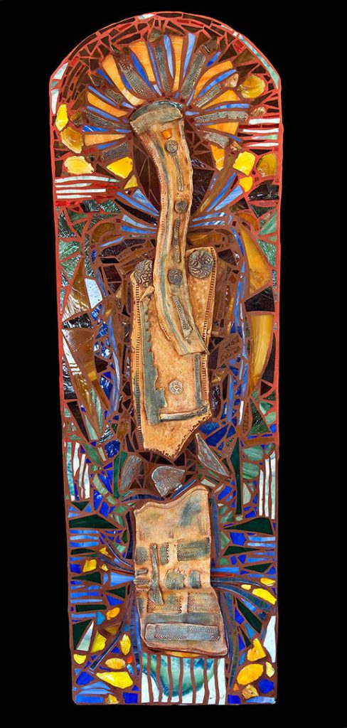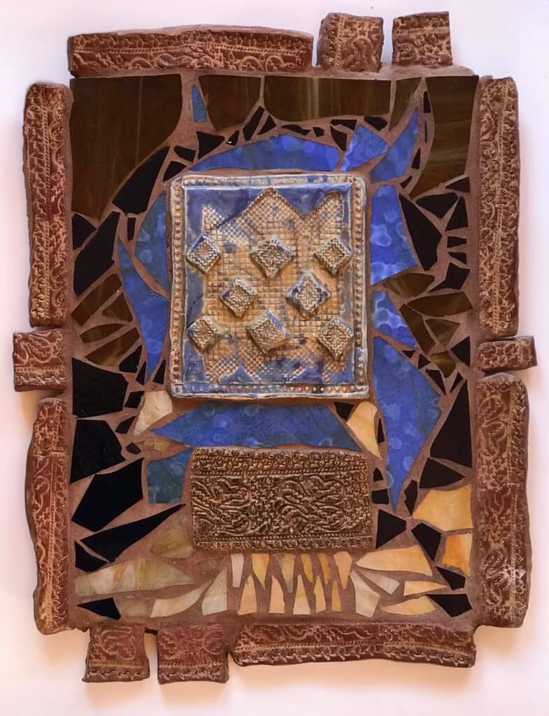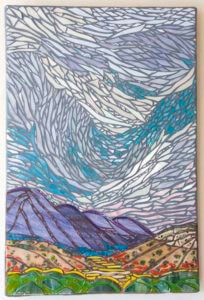 Using a mosaic as an illustration, Laura retells and reimagines her childhood stories through a lens of personal wisdom. Dreams, insights, and teachings take on a storybook form, honoring mystery, the unknown cosmos, nature, and heart. Pieces of uniquely formed clay join with cut, fused, and slumped glass to create the mosaic images. The series was displayed at Wild Hearts Gallery, Placitas, NM, during the month of October 2025.