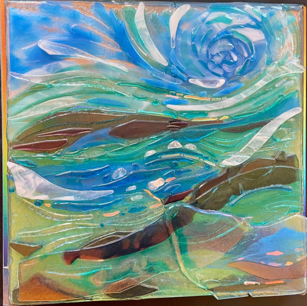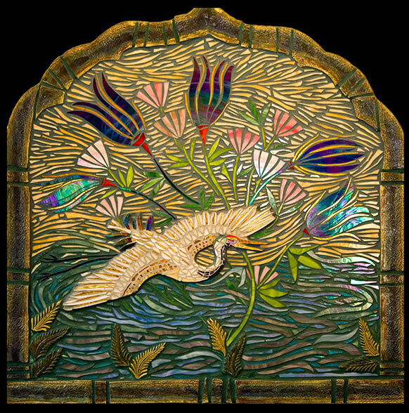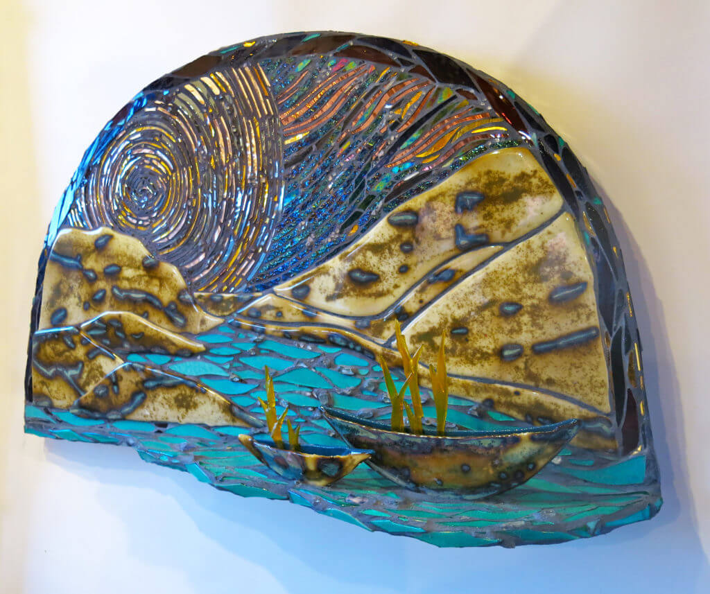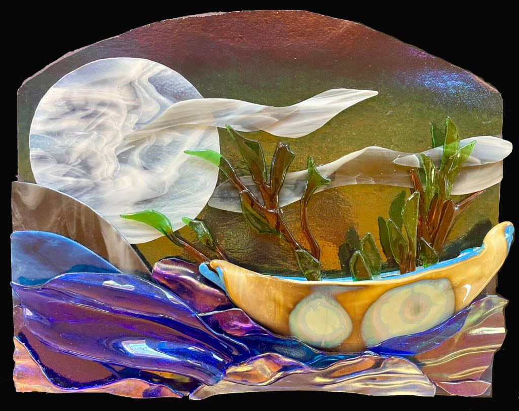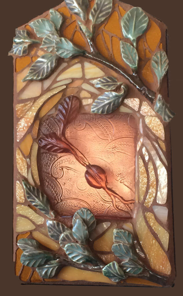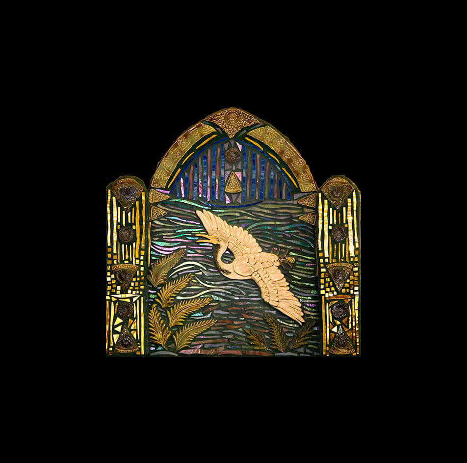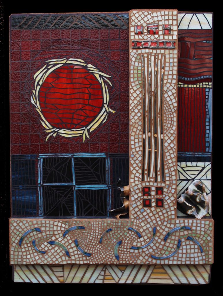 Using a mosaic as an illustration, Laura retells and reimagines her childhood stories through a lens of personal wisdom. Dreams, insights, and teachings take on a storybook form, honoring mystery, the unknown cosmos, nature, and heart. Pieces of uniquely formed clay join with cut, fused, and slumped glass to create the mosaic images. The series was displayed at Wild Hearts Gallery, Placitas, NM, during the month of October 2025.