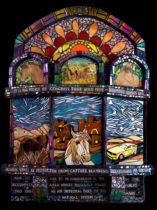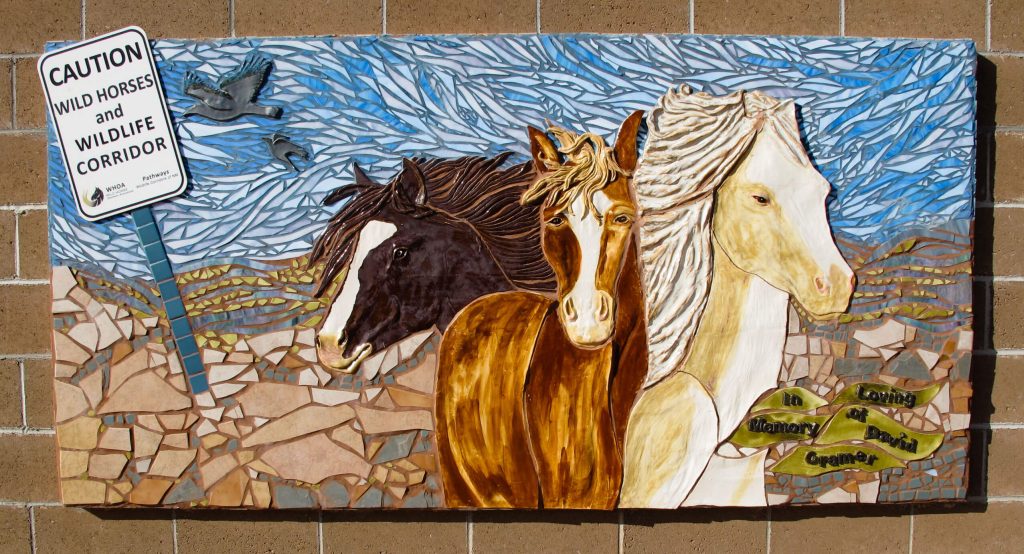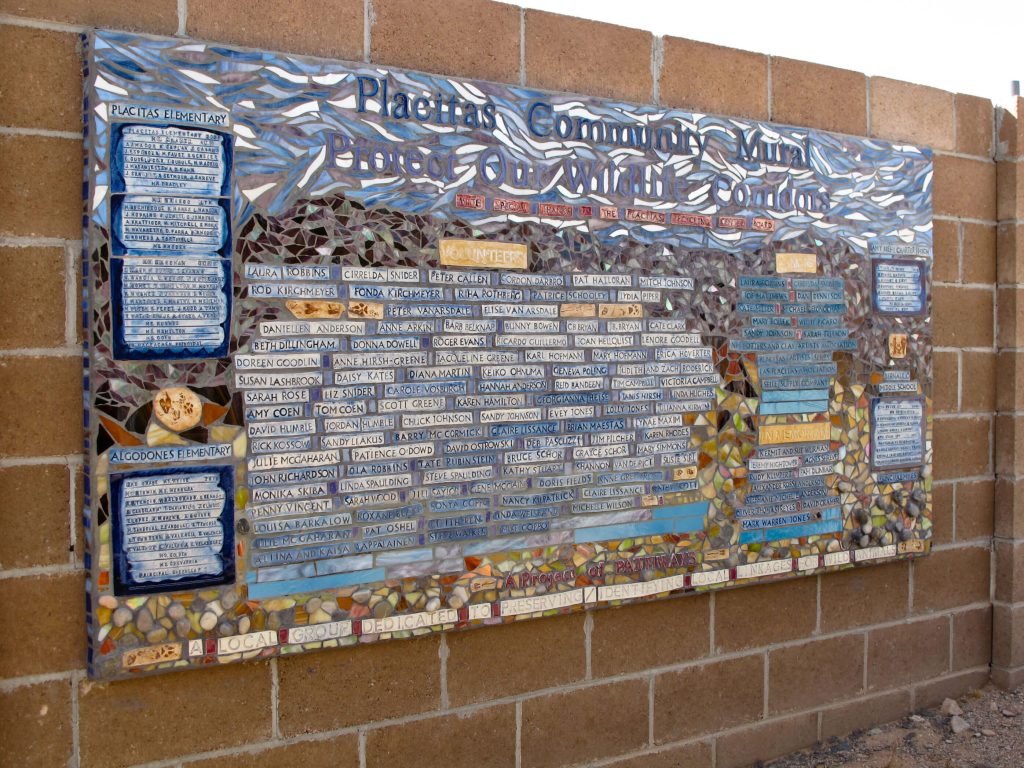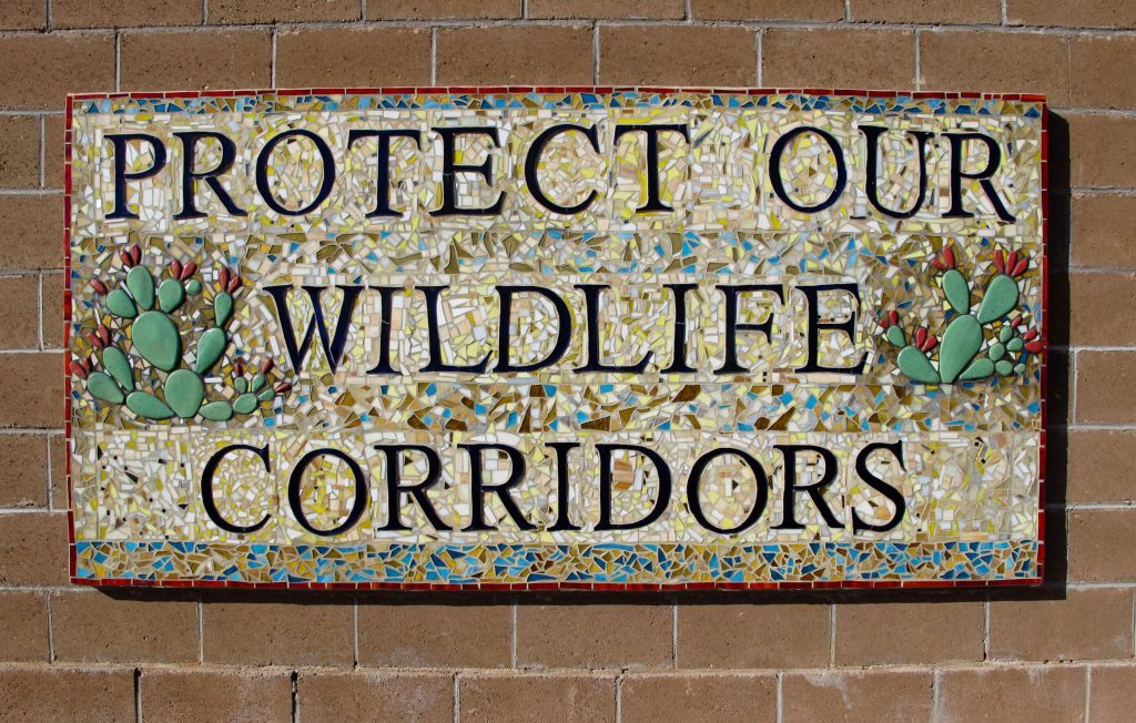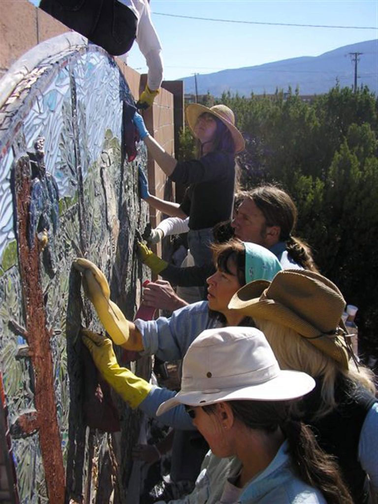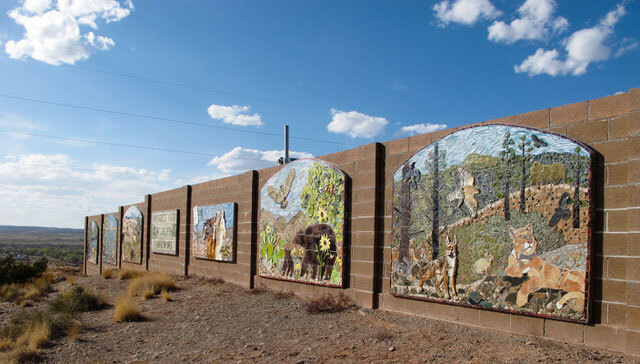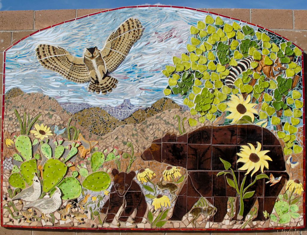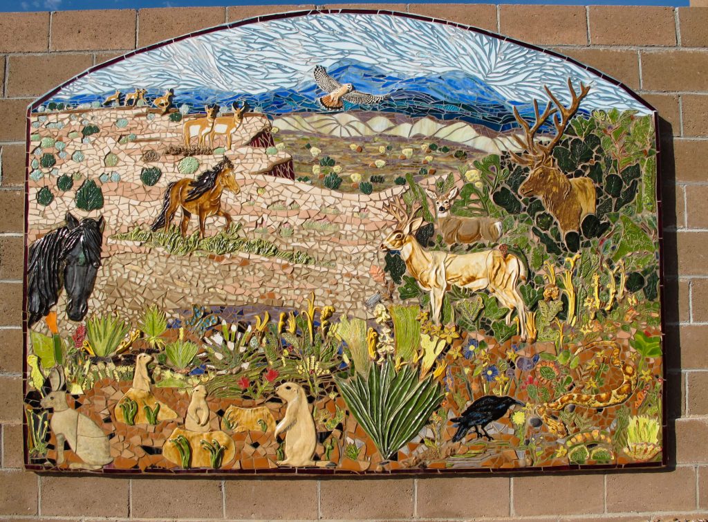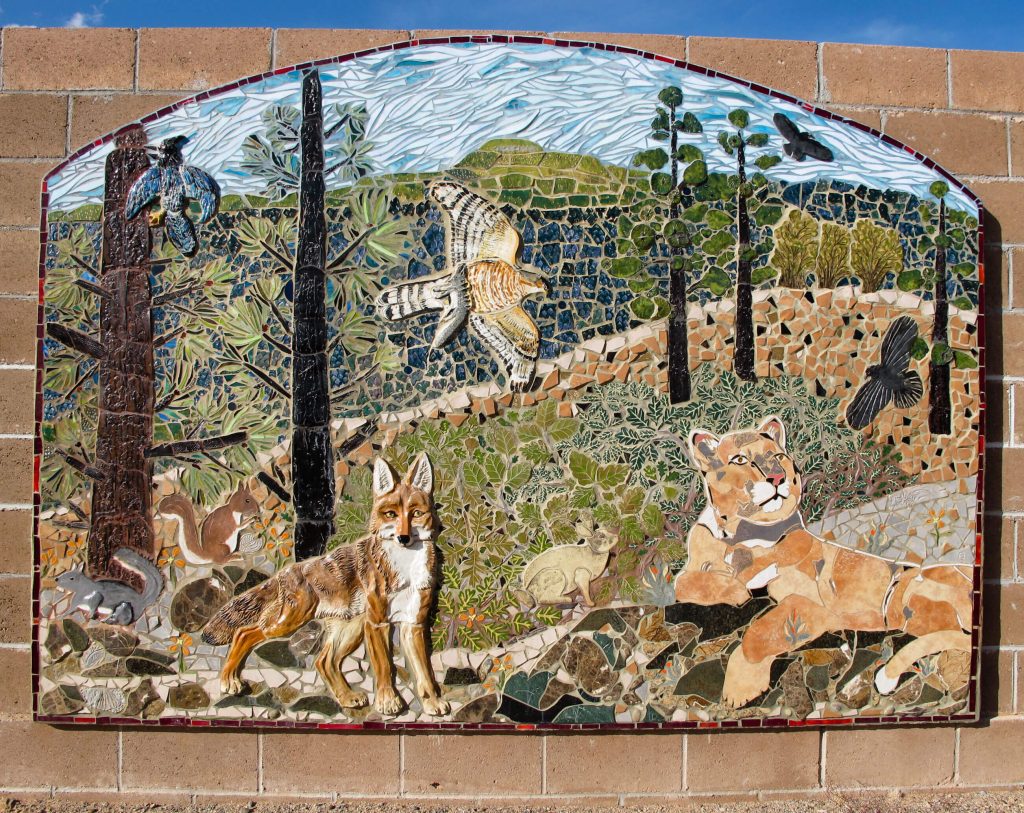 Laura co-facilitated the seventy foot long Placitas Community mosaic mural, Protect Our Wildlife Corridors, a project of Pathways, Wildlife Corridors of NM. The collaborative endeavor took approximately four years to complete. Over one hundred neighbors, including school children, participated. Each panel (approximately 8’w x 6’h) depicts a local ecosystem.